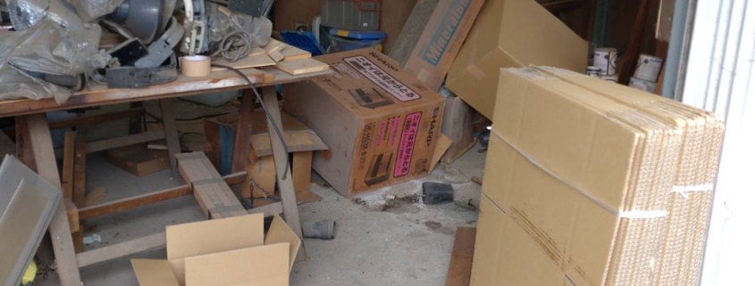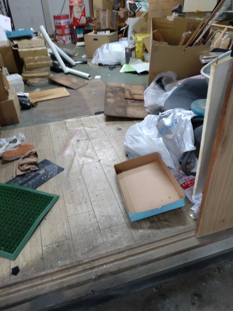 屋内には作業で使用していた木材・鉄パイプ・脚立・段ボールが散在しており、一部は棚や床下にも古い資材が残されている状態でした。