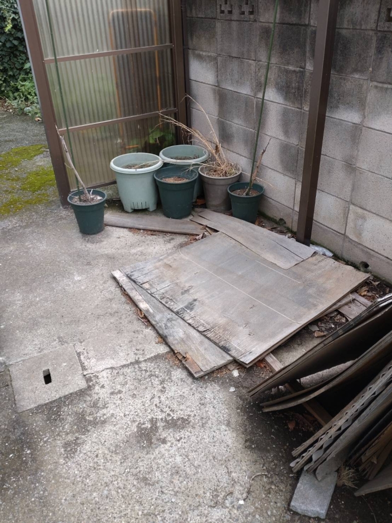 また、屋外のスペースにも古材やプランター、看板部材が放置されており、通路の確保と安全搬出が大きな課題でした。