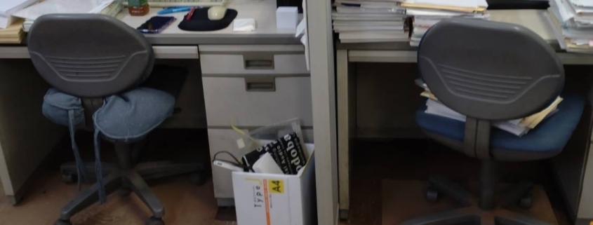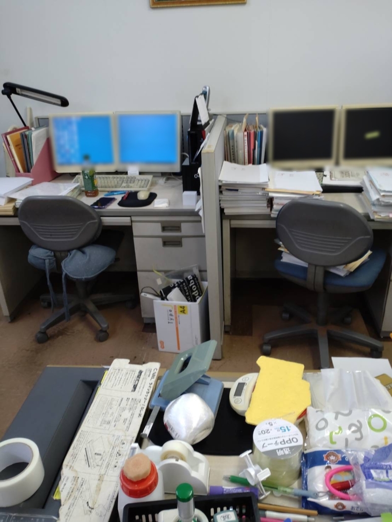 室内には 大量の紙資料・ファイル類・古い伝票の束 が机や棚にぎっしり残されており、床には梱包資材や雑貨が散乱。