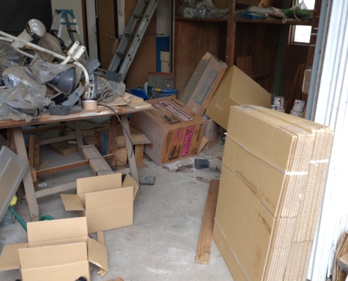 屋内には作業で使用していた木材・鉄パイプ・脚立・段ボールが散在しており、一部は棚や床下にも古い資材が残されている状態でした。